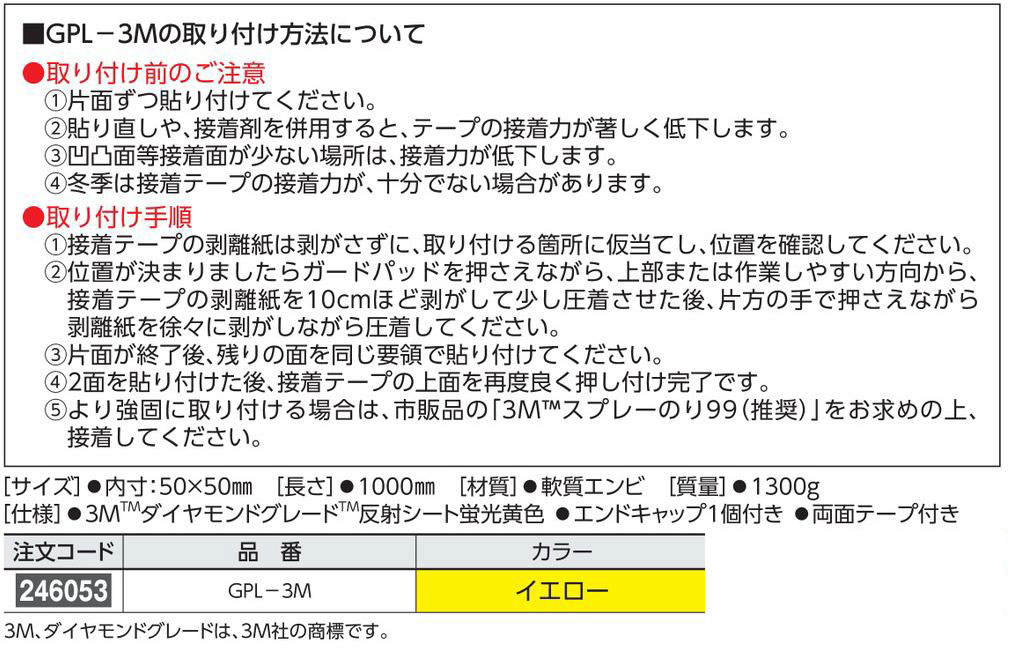 サイズ 内寸:50×50mm 長さ 1000mm 材質 軟質エンビ 質量 1300g カラー イエロー 仕様 3M ダイヤモンドグレード反射シート蛍光黄色 エンドキャップ1個付き 両面テープ付き ※3M、ダイヤモンドグレードは3M社商標です。