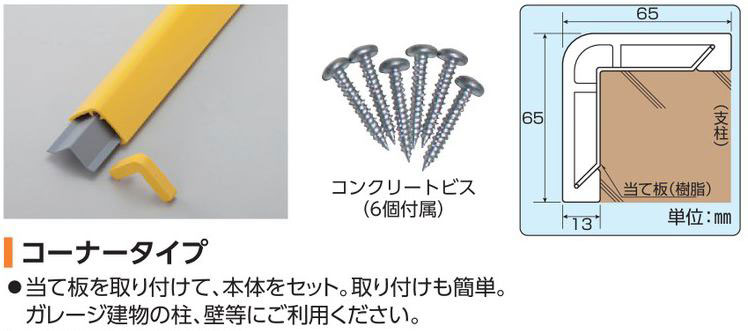 メーカー:日本緑十字社 サイズ 65×65×13mm 長さ 1000mm 材質 本体:軟質エンビ 当て板:硬質エンビ カラー グレー 仕様 エンドキャップ2個付き コンクリートビス6個付き 両面テープ(仮止め用) 取付手順書付き ※鉄等に直接取り付ける場合は、ドリルビスをご使用ください。ドリルビスに関しましては、お問い合わせください。