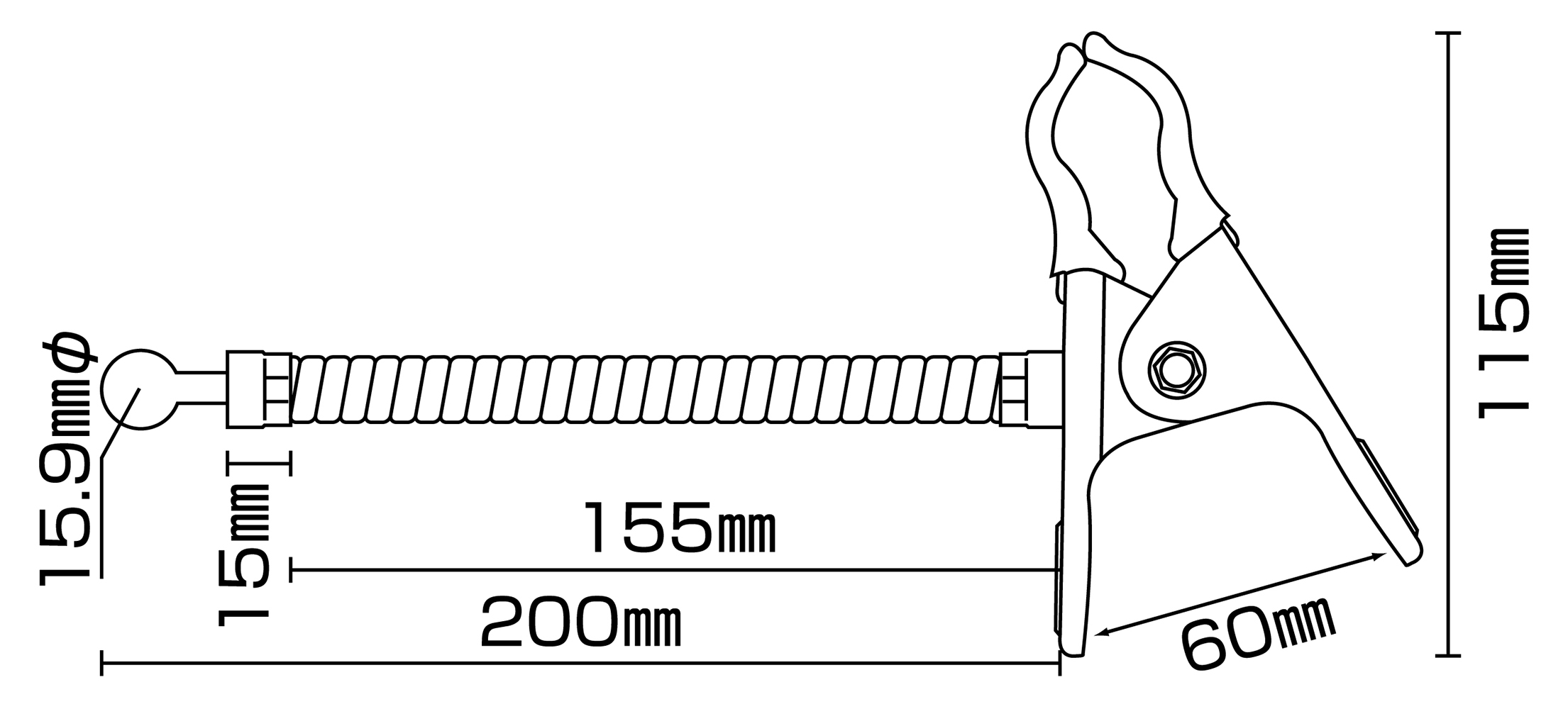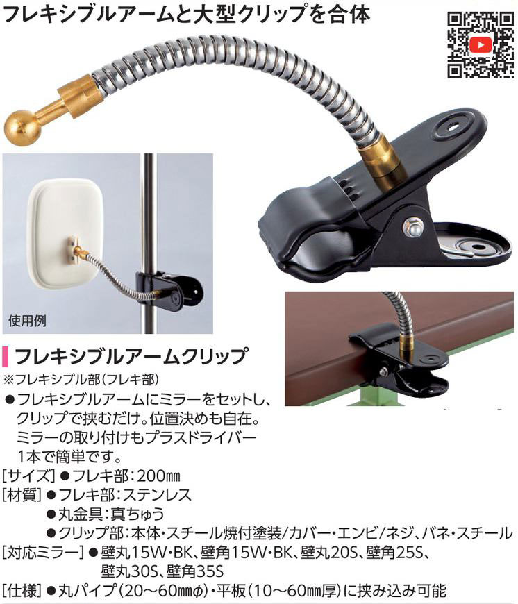 メーカー:日本緑十字社 サイズ フレキ部:200mm 材質 フレキ部:ステンレス 丸金具:真ちゅう クリップ部:本体・スチール焼付塗装/カバー・エンビ/ネジ、バネ・スチール 対応ミラー 壁丸15W・BK、壁角15W・BK、壁丸20S、壁角25S、壁丸30S、壁角35S 仕様 丸パイプ(20~60mmΦ)・平板(10~60mm厚)に挟み込み可能