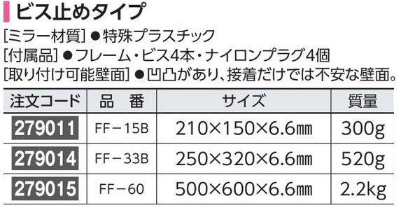 メーカー:日本緑十字社 サイズ 500×600×6.6mm 質量 2.2kg ミラー材質 特殊プラスチック 付属品 フレーム・ビス4本・ナイロンプラグ4個 取り付け可能壁面 凹凸があり、接着剤だけでは不安な壁面。