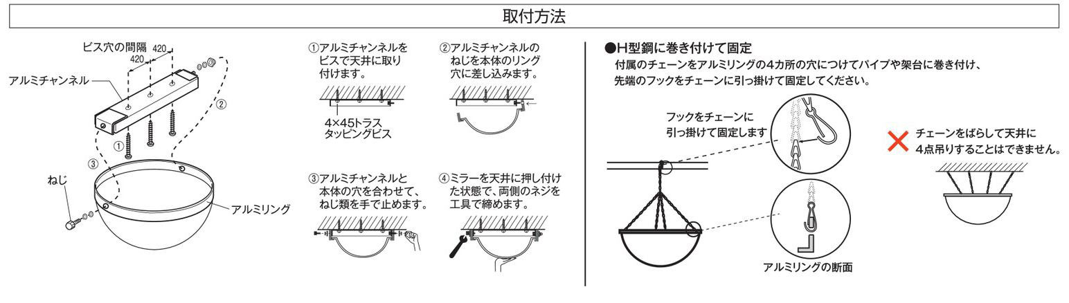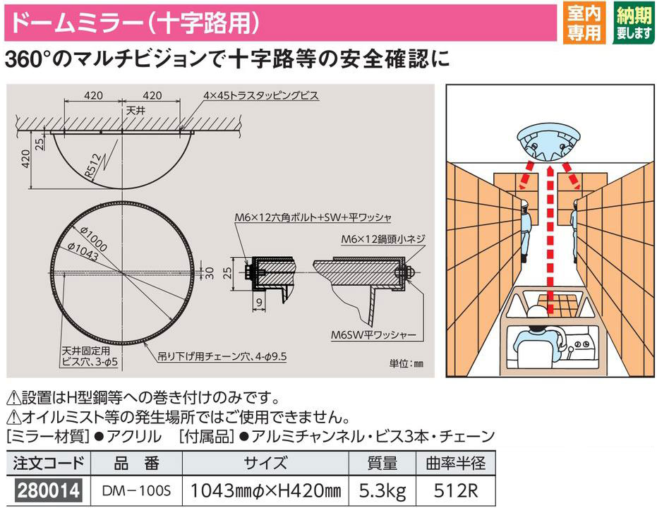 メーカー:日本緑十字社 サイズ 1043mmΦ×H420mm 質量 5.3kg 曲率半径 512R ミラー材質 アクリル 付属品 アルミチャンネル・ビス3本・チェーン