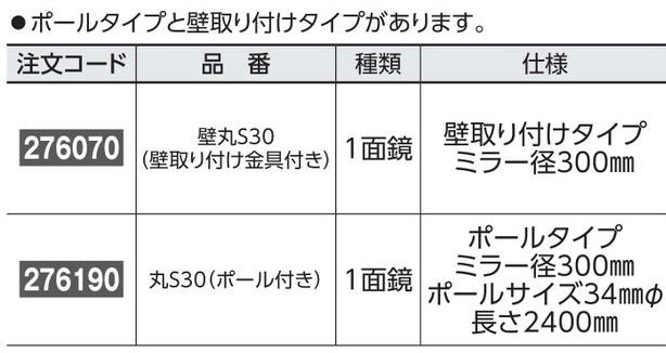 メーカー:日本緑十字社 アクリル製ミラー 種類 1面鏡 仕様 ポールタイプ ミラー径 300mm ポールサイズ34mmΦ 長さ2400mm