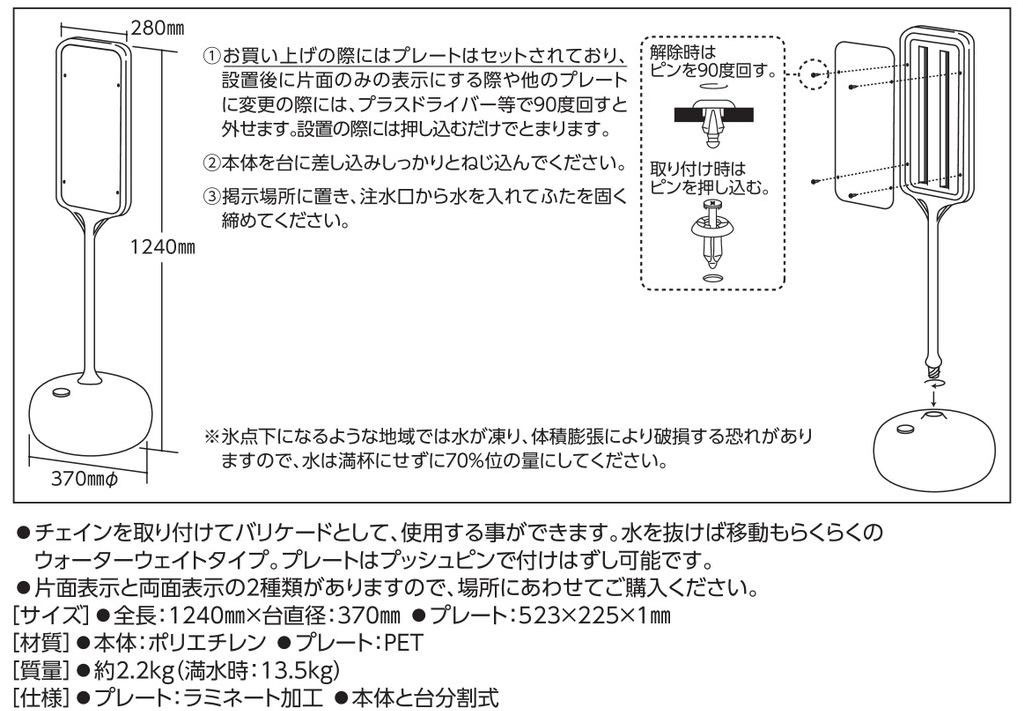 サイズ 全長:1240mm×台直径:370mm プレート:523×225×1mm 材質 本体:ポリエチレン プレート:PET 質量 約2.2kg(満水時:13.5kg) 仕様 プレート:ラミネート加工 本体と台分割式 両面表示