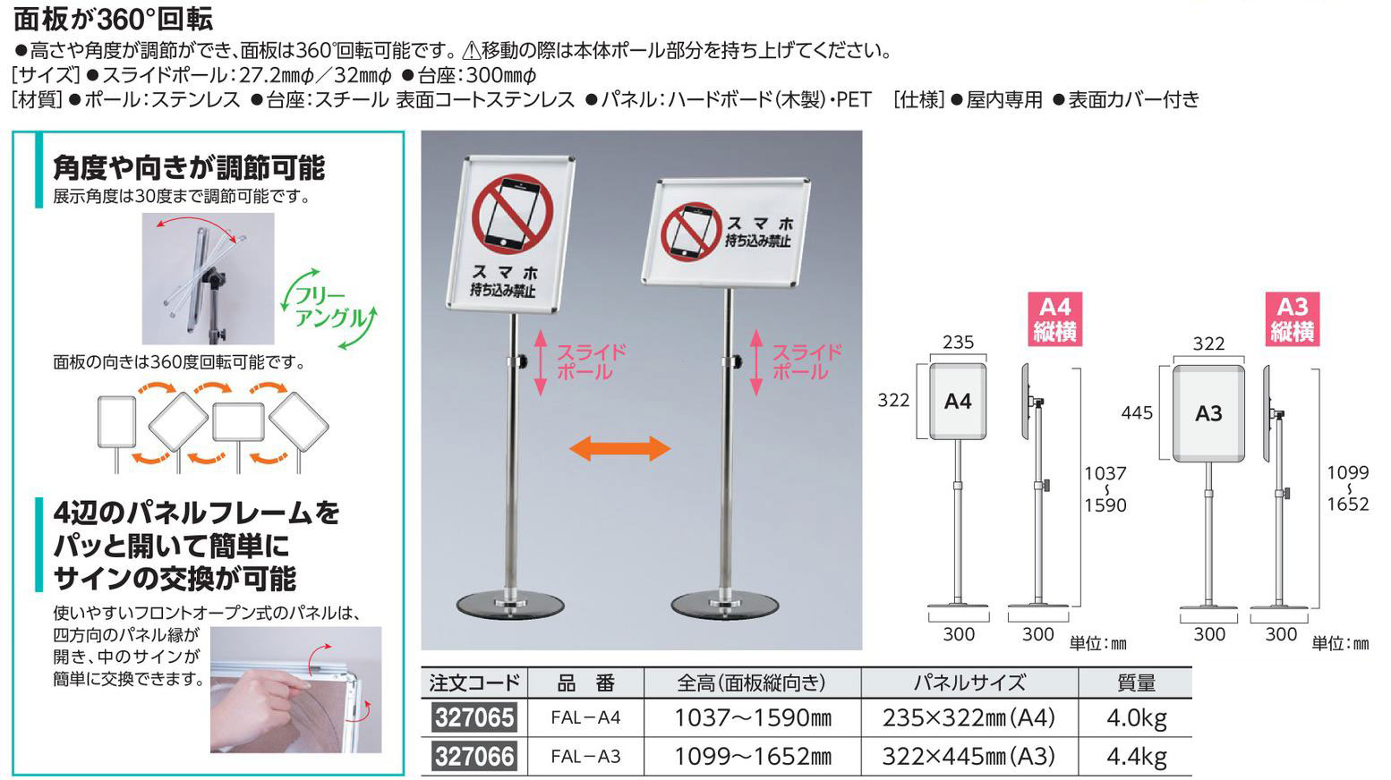 メーカー:日本緑十字社 全高(面板縦向き) 1099~1652mm パネルサイズ 322×445mm(A3) 質量 4.4kg サイズ スライドポール:27.2mmΦ/32mmΦ 台座:300mmΦ 材質 ポール:ステンレス 台座:スチール 表面コートステンレス パネル:ハードボード(木製)・PET 仕様 屋内専用 表面カバー付き