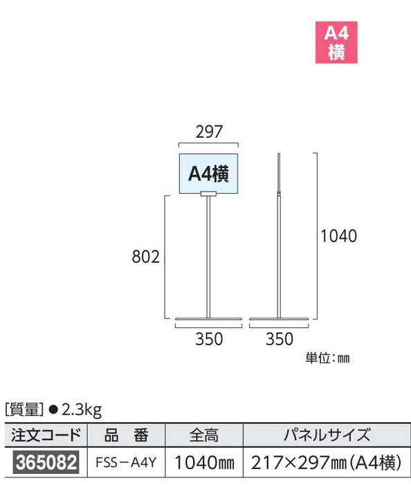 メーカー:日本緑十字社 全高 1040mm パネルサイズ 217×297mm(A4横) サイズ 台座:350mm角×厚み1.6mm厚 面板:1mm厚 芯材:3mm厚 質量 2.3kg 材質 ポール:ステンレス 台座:ガルバニウム鋼板 面板:エンビ 芯材:アルミ複合板 仕様 屋内専用 付属品 六角レンチ付き