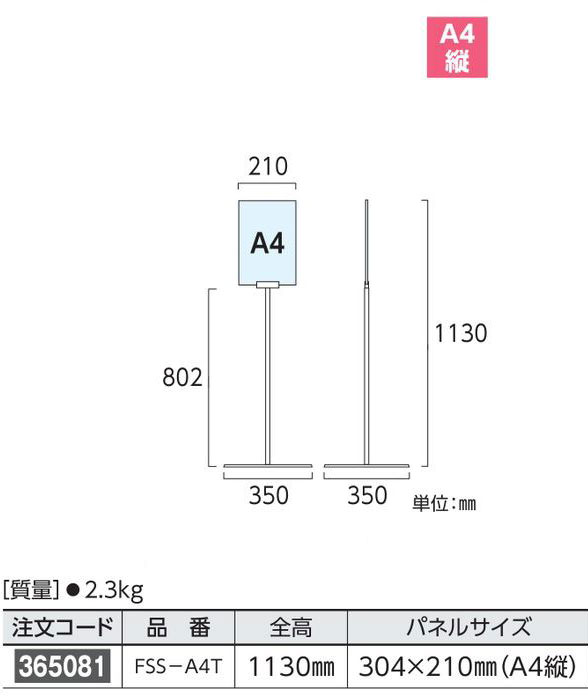 メーカー:日本緑十字社 全高 1130mm パネルサイズ 304×210mm(A4縦) サイズ 台座:350mm角×厚み1.6mm厚 面板:1mm厚 芯材:3mm厚 質量 2.3kg 材質 ポール:ステンレス 台座:ガルバニウム鋼板 面板:エンビ 芯材:アルミ複合板 仕様 屋内専用 付属品 六角レンチ付き