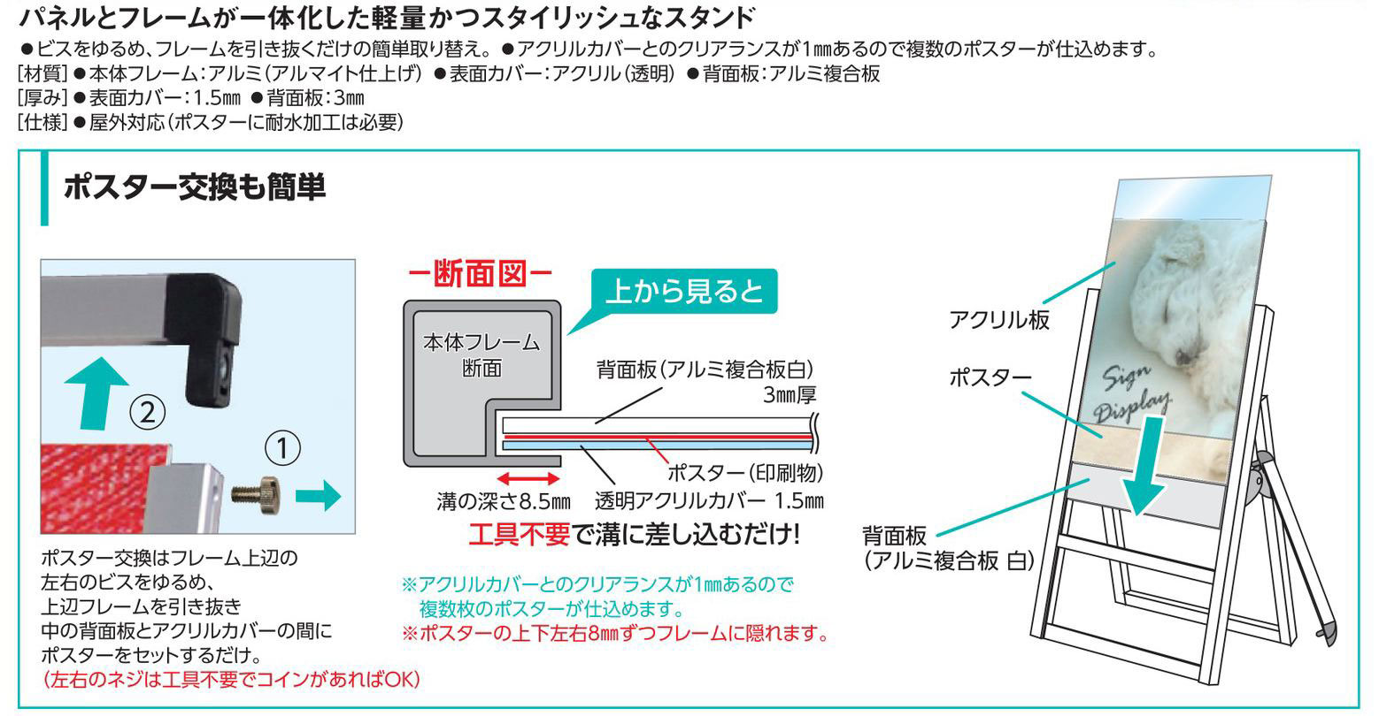 メーカー:日本緑十字社 サイズ 背面板サイズ・B2:728×515mm 面板有効サイズ:712×499mm カラー ブラック 質量 4.0kg 材質 本体フレーム:アルミ(アルマイト仕上げ) 表面カバー:アクリル(透明) 背面板:アルミ複合板 厚み 表面カバー 1.5mm 背面板:3mm 仕様 屋外対応(ポスターに耐水加工は必要)