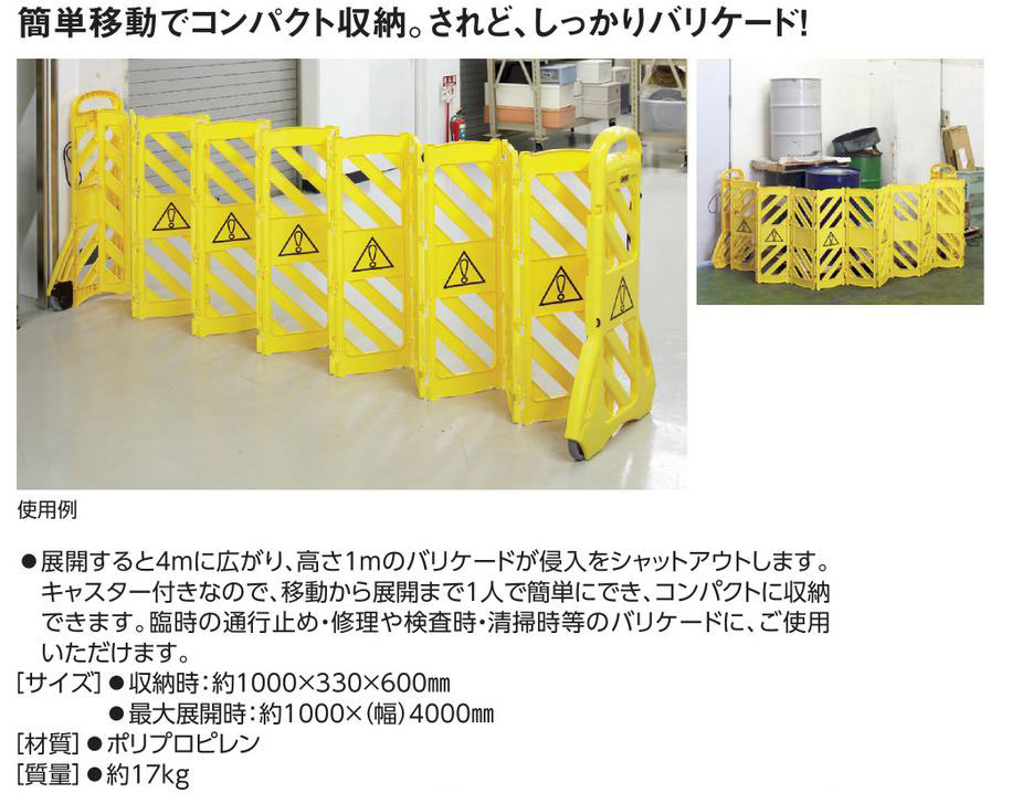 メーカー:日本緑十字社 サイズ 収納時:約1000×330×600mm 最大展開時:約1000×(幅)4000mm 材質 ポリプロピレン 質量 約17kg