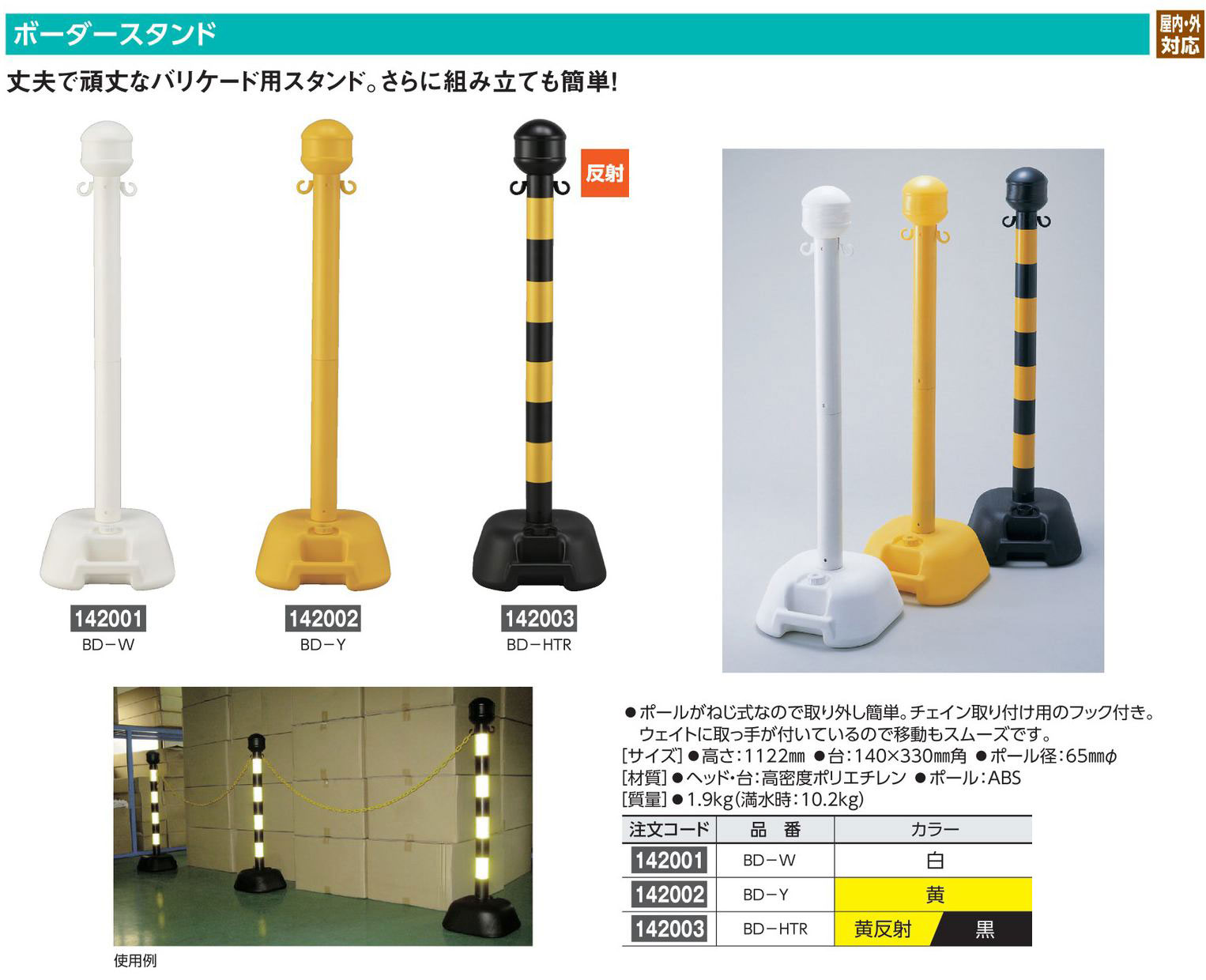 サイズ 高さ:1122mm 台:140×330mm角 ポール径:65mmΦ 材質 ヘッド・台:高密度ポリエチレン ポール:ABS 質量 1.9kg(満水時:10.2kg) カラー 白