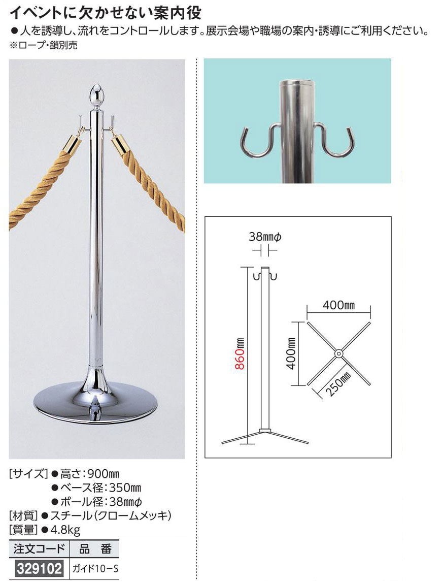 メーカー:日本緑十字社 サイズ 高さ:900mm ベース径:350mm ポール径:38mmΦ 材質 スチール(クロームメッキ) 質量 4.8kg ※ロープ・鎖別売